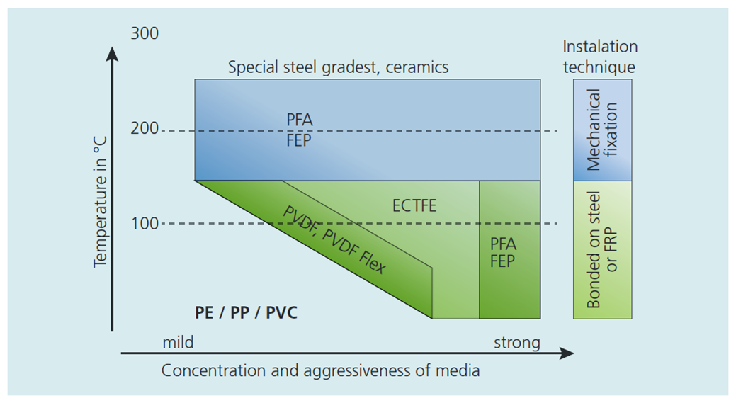 Có nhiều lựa chọn vật liệu và độ dày của lớp nhựa lót cho bồn bể để khách hàng lựa chọn, căn cứ vào khả năng tương thích hóa chất của vật liệu nhựa lót và điều kiện sử dụng (nhiệt độ, áp suất, nồng độ hóa chất).