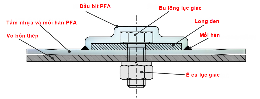Tấm nhựa PFA của AGRU có thể được gắn chặt vào bồn thép bằng cách sử dụng các điểm cố định cơ học như kẹp, bu lông hoặc vít. Hệ thống nhựa lót PFA này chủ yếu được sử dụng cho các ứng dụng khí thải và hệ thống khử lưu huỳnh ở nhiệt độ lên đến 260° C (500° F).