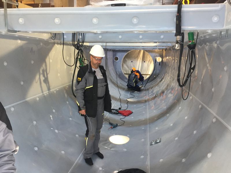 Cuối cùng, sau khi đã gắn các phần nhựa PFA riêng biệt lên toàn bộ bề mặt của bồn thép, thực hiện việc hàn các mối tiếp giáp giữa các tấm nhựa PFA với nhau bằng phương pháp hàn khí nóng theo tiêu chuẩn DVS 2207-3 và kiểm tra lại chất lượng mối hàn bằng dụng cụ phát tia lửa cao áp theo tiêu chuẩn DVS 2206-4.
